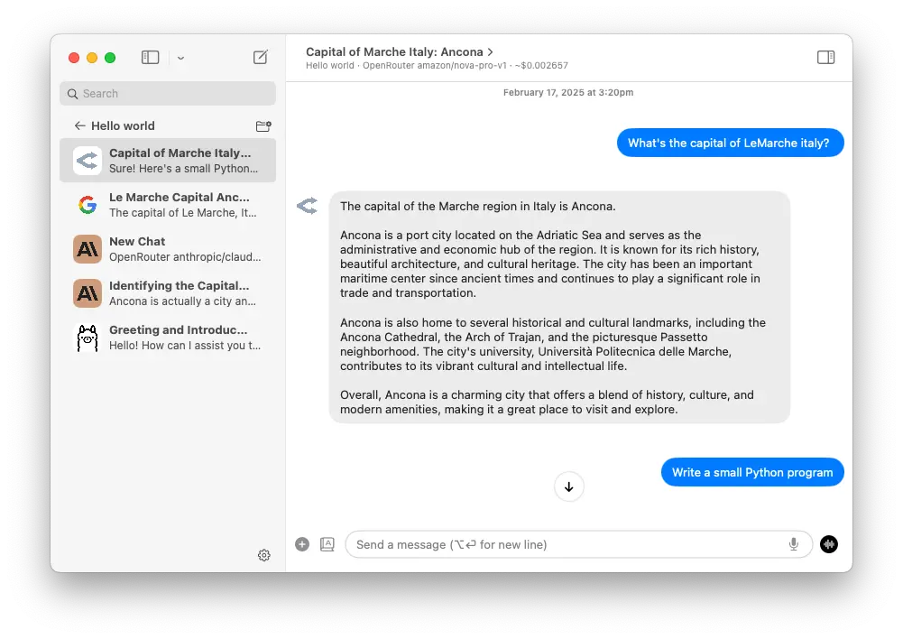 There are a lot of things I like about BoltAI. But my favorite one is that I can use a single interface for just about any model under the sun (and running on my laptop). I've also setup OpenRouter, so I can try out any tropical model/provider combo with just a few clicks. It's a one time purchase - and Daniel is super responsive.