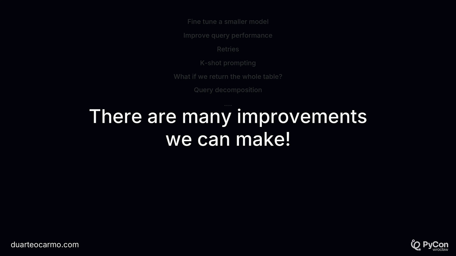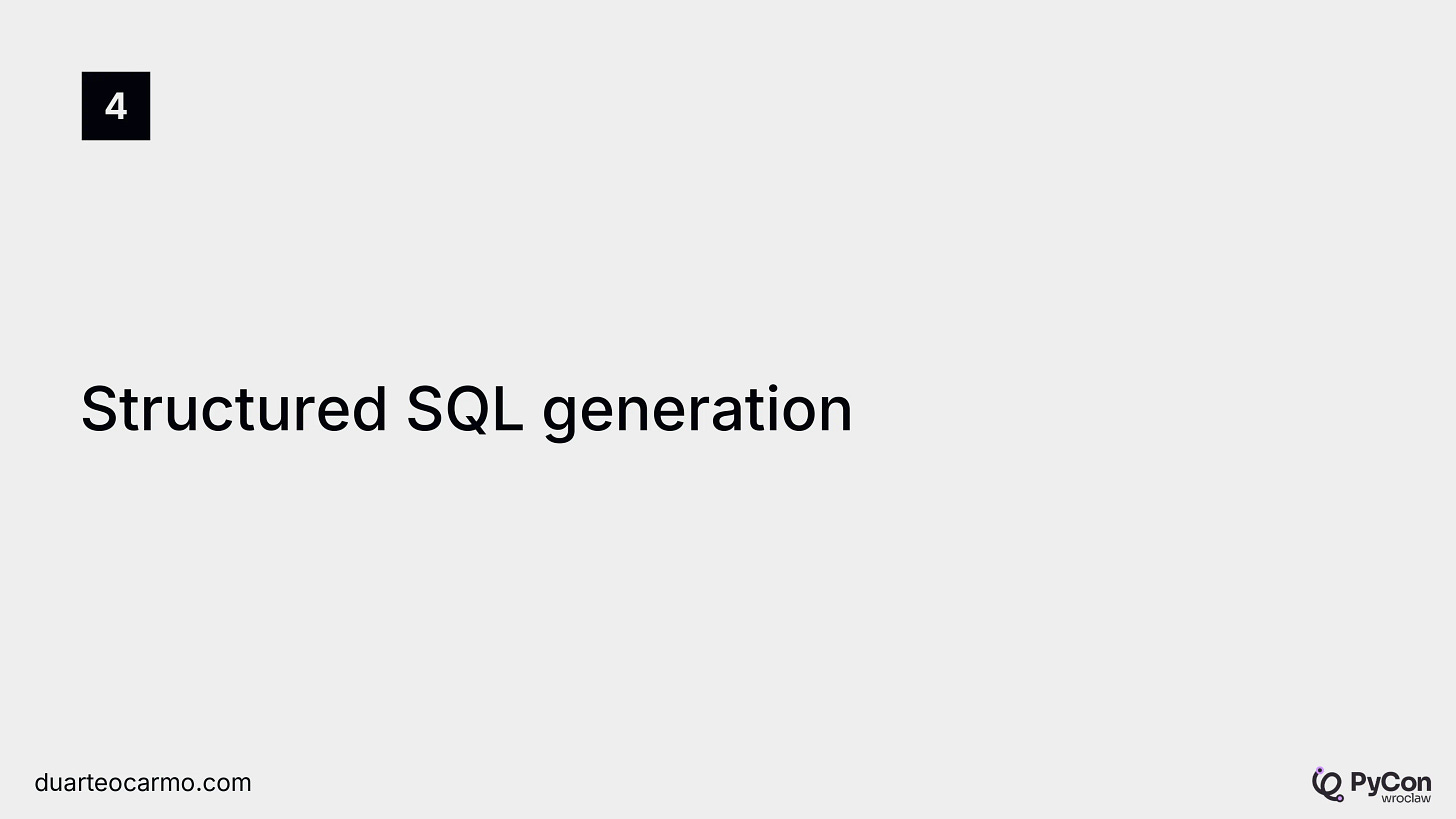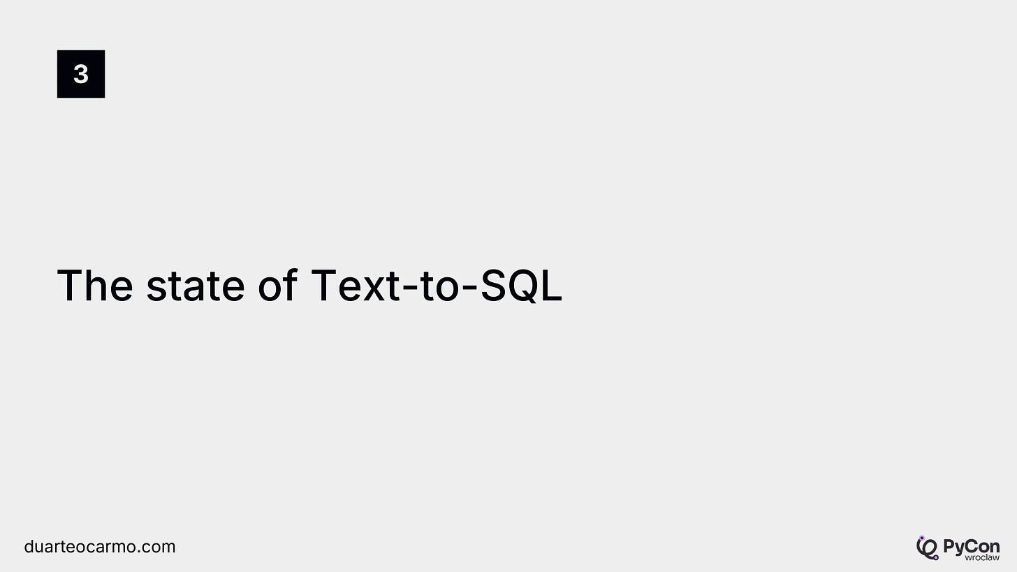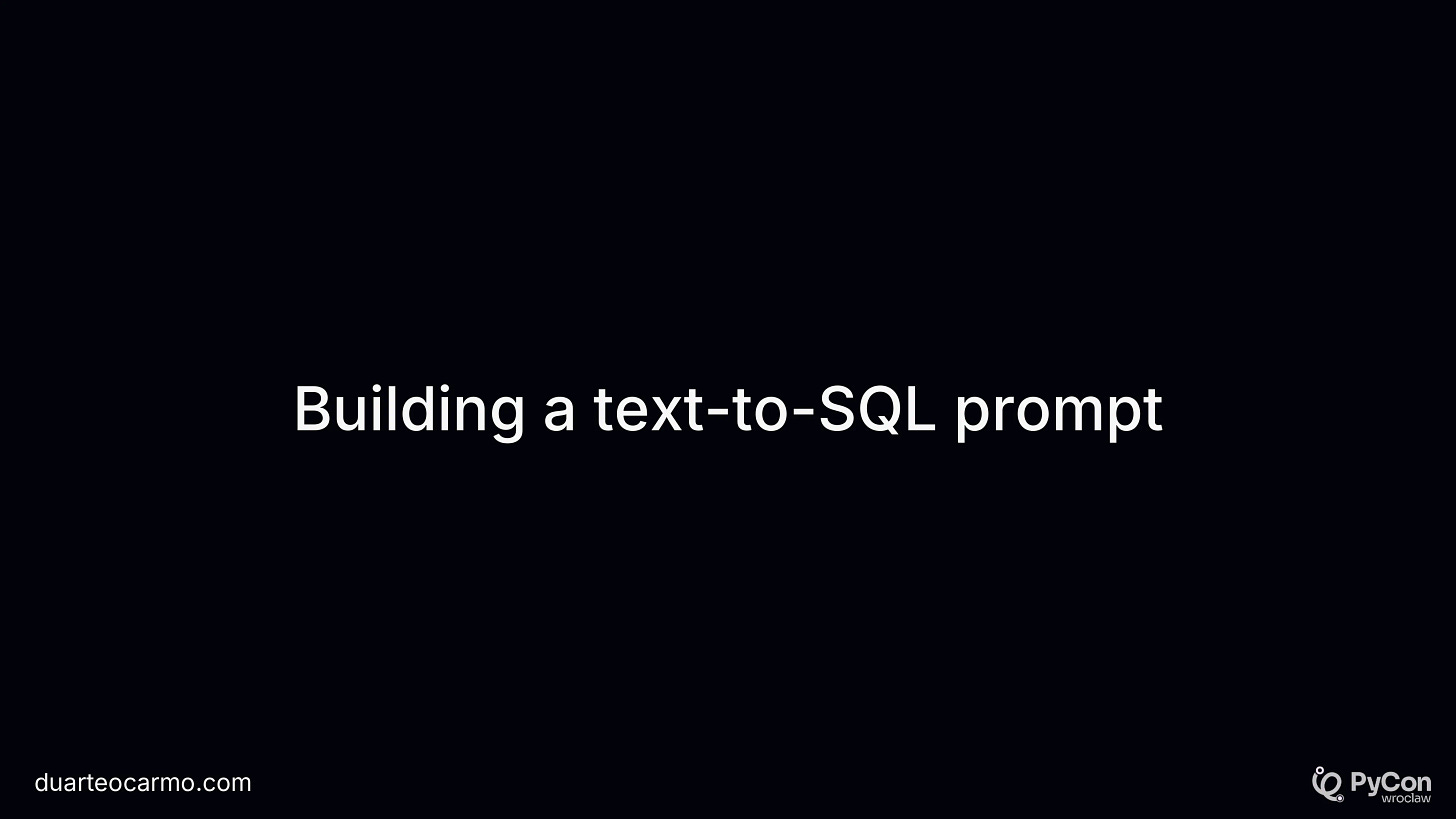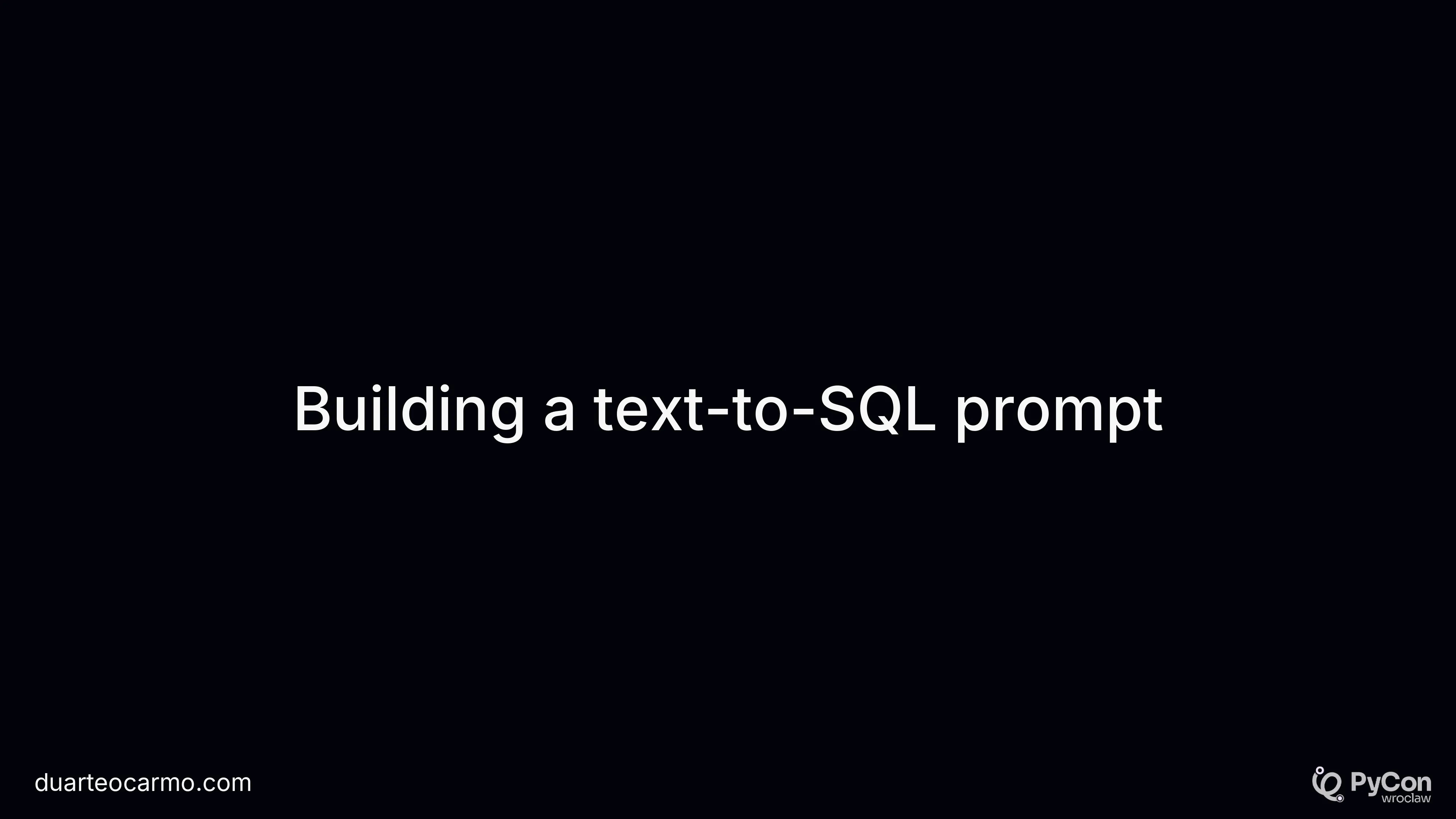 Last year I made an effort to speak less and learn more. However, I still had the opportunity to present at a couple of conferences. One of them was PyCon Wroclaw. The main goal was to talk about a couple of interesting paradigms I've come across while using LLMs to help me solve some Text-to-SQL problems.