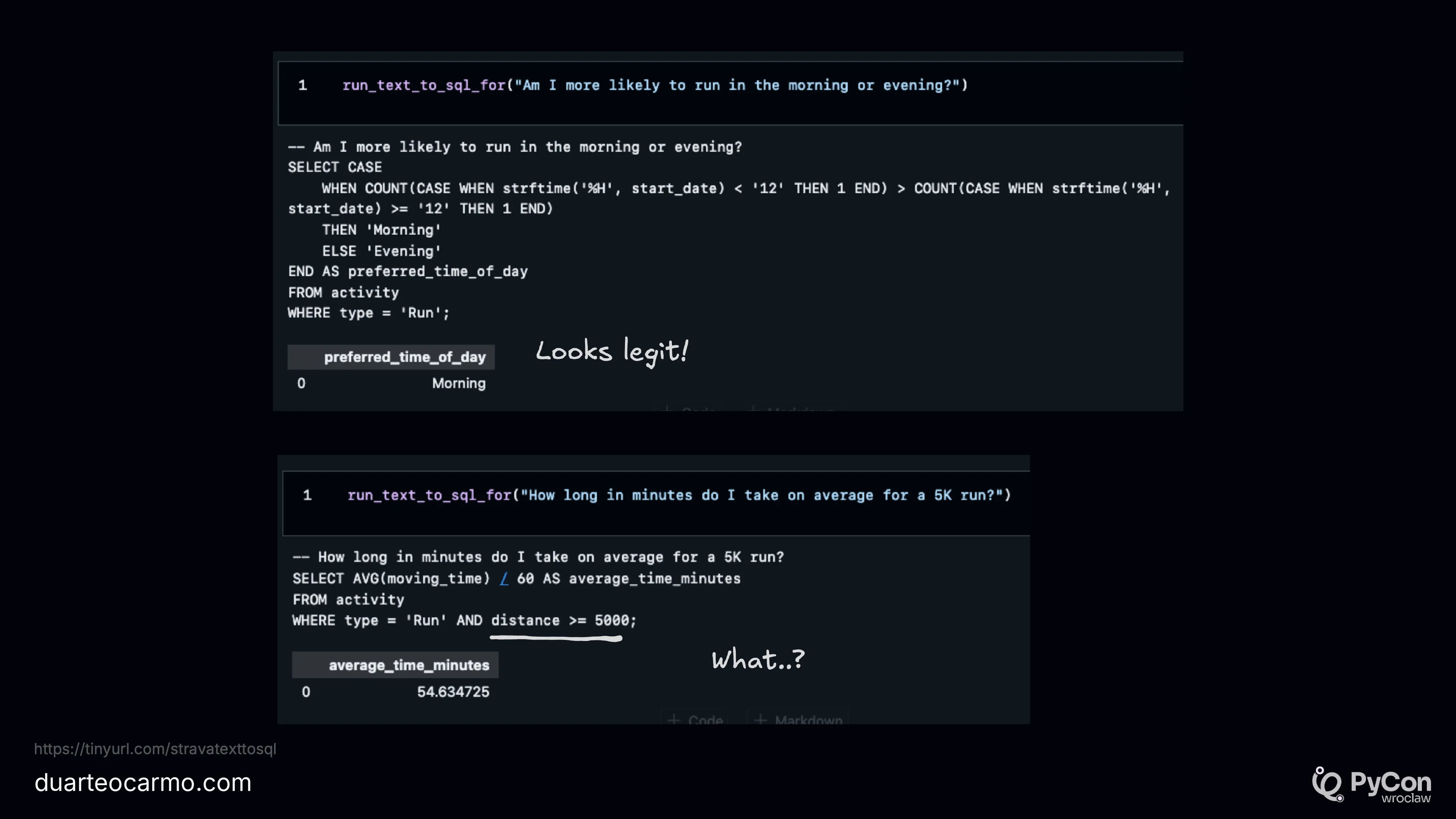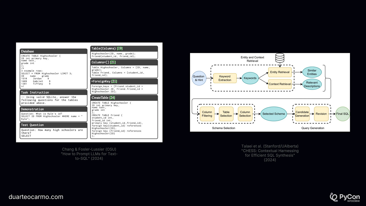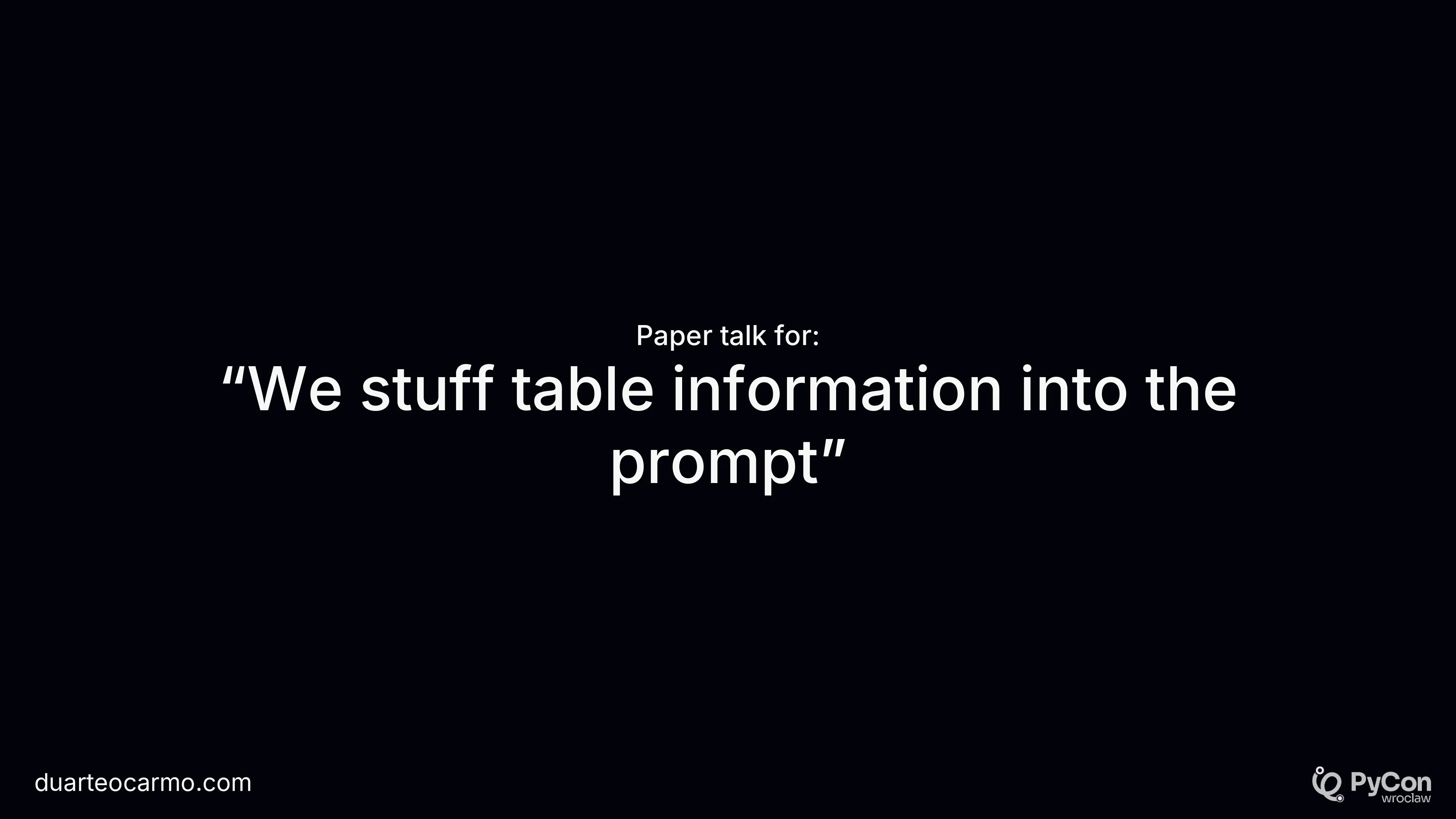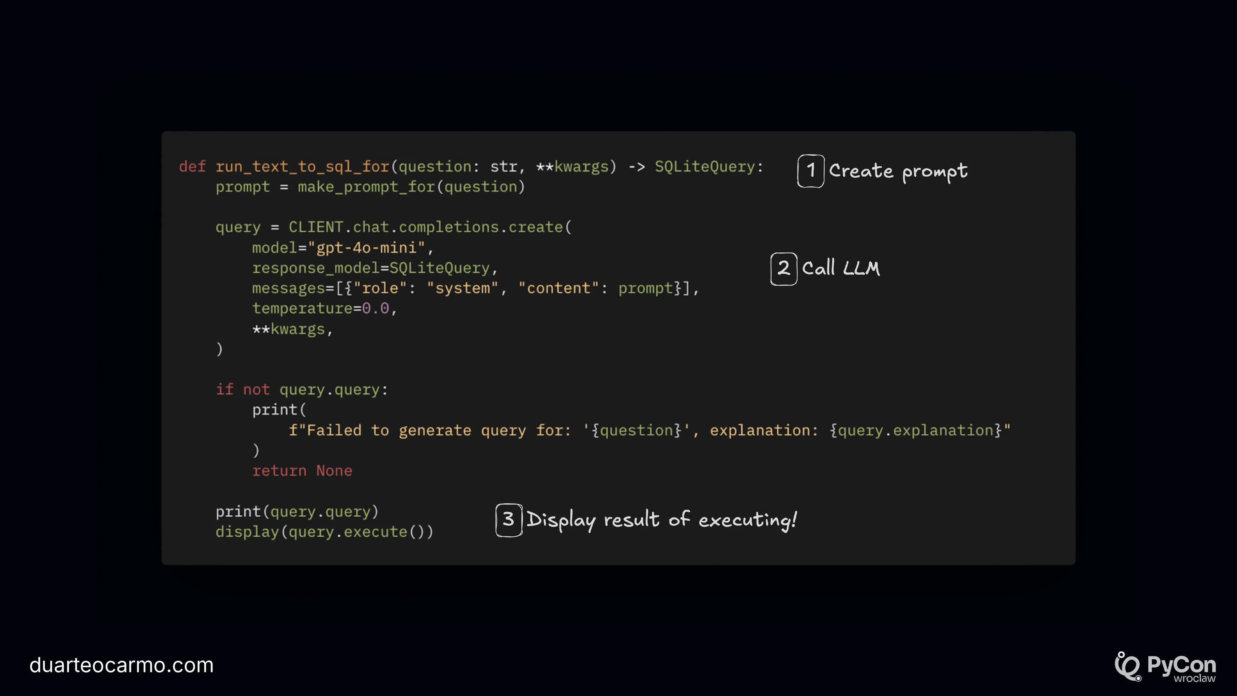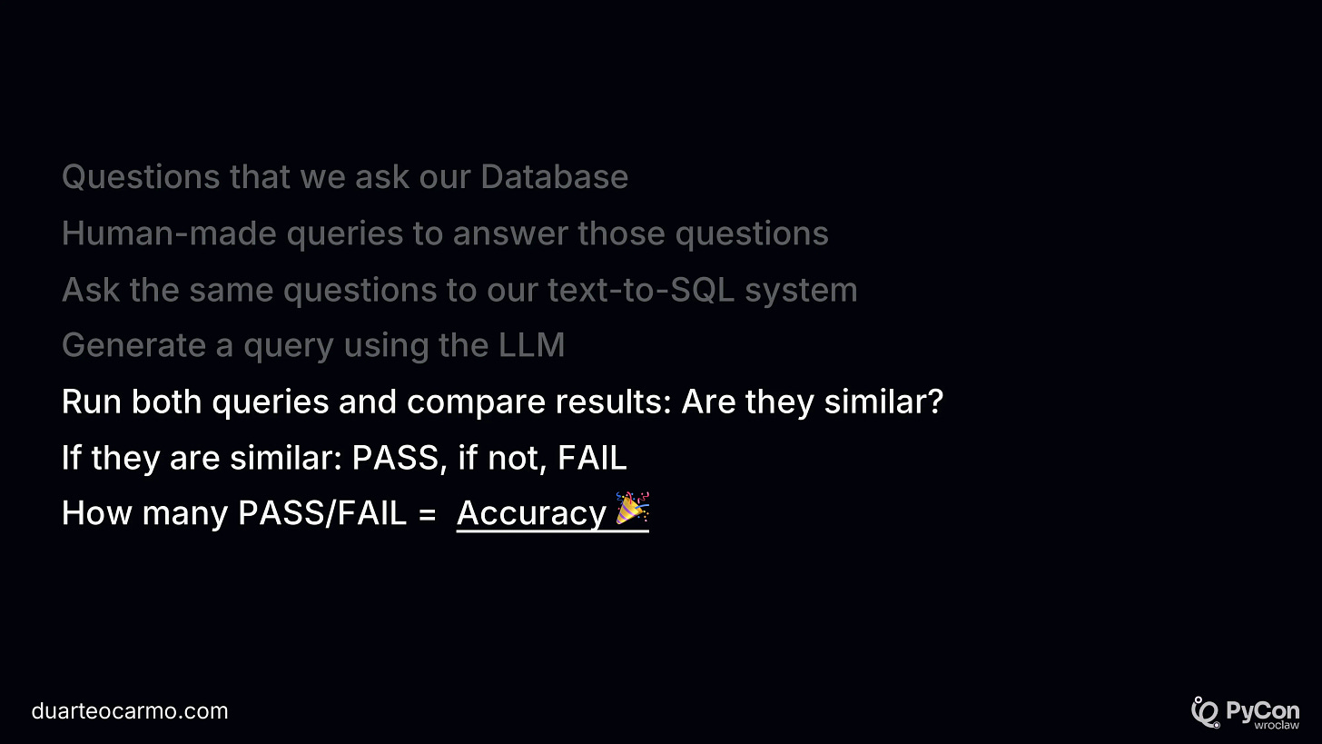 Last year I made an effort to speak less and learn more. However, I still had the opportunity to present at a couple of conferences. One of them was PyCon Wroclaw. The main goal was to talk about a couple of interesting paradigms I've come across while using LLMs to help me solve some Text-to-SQL problems.