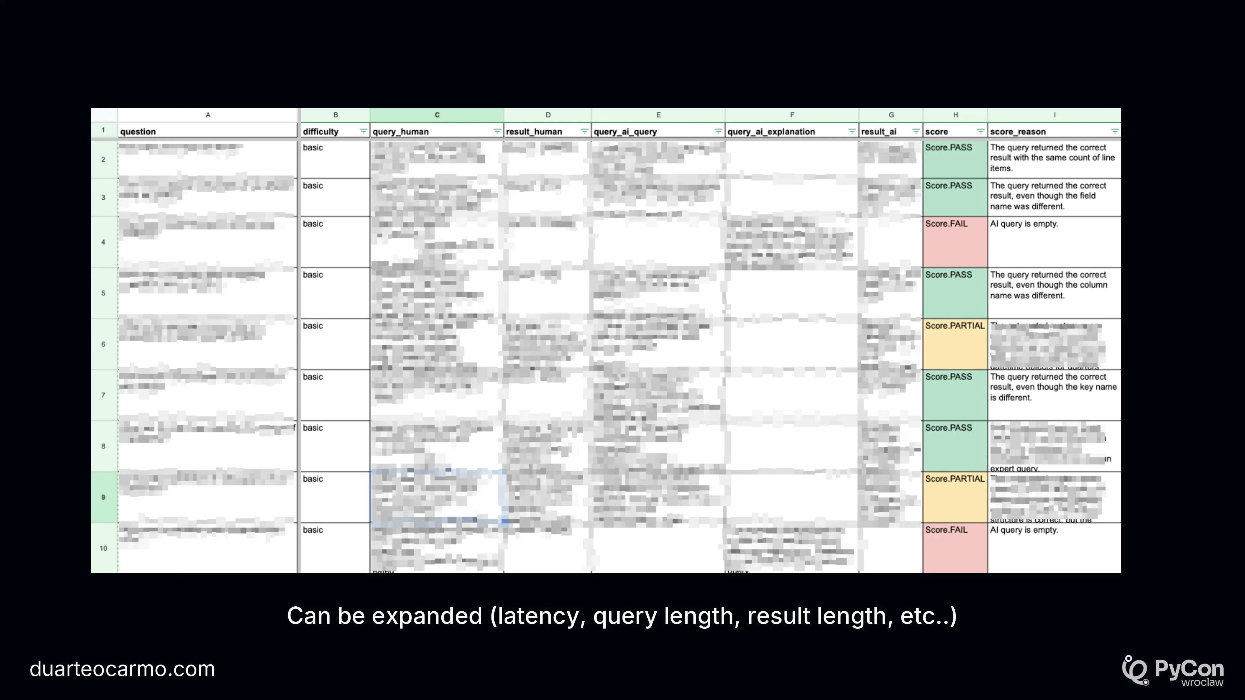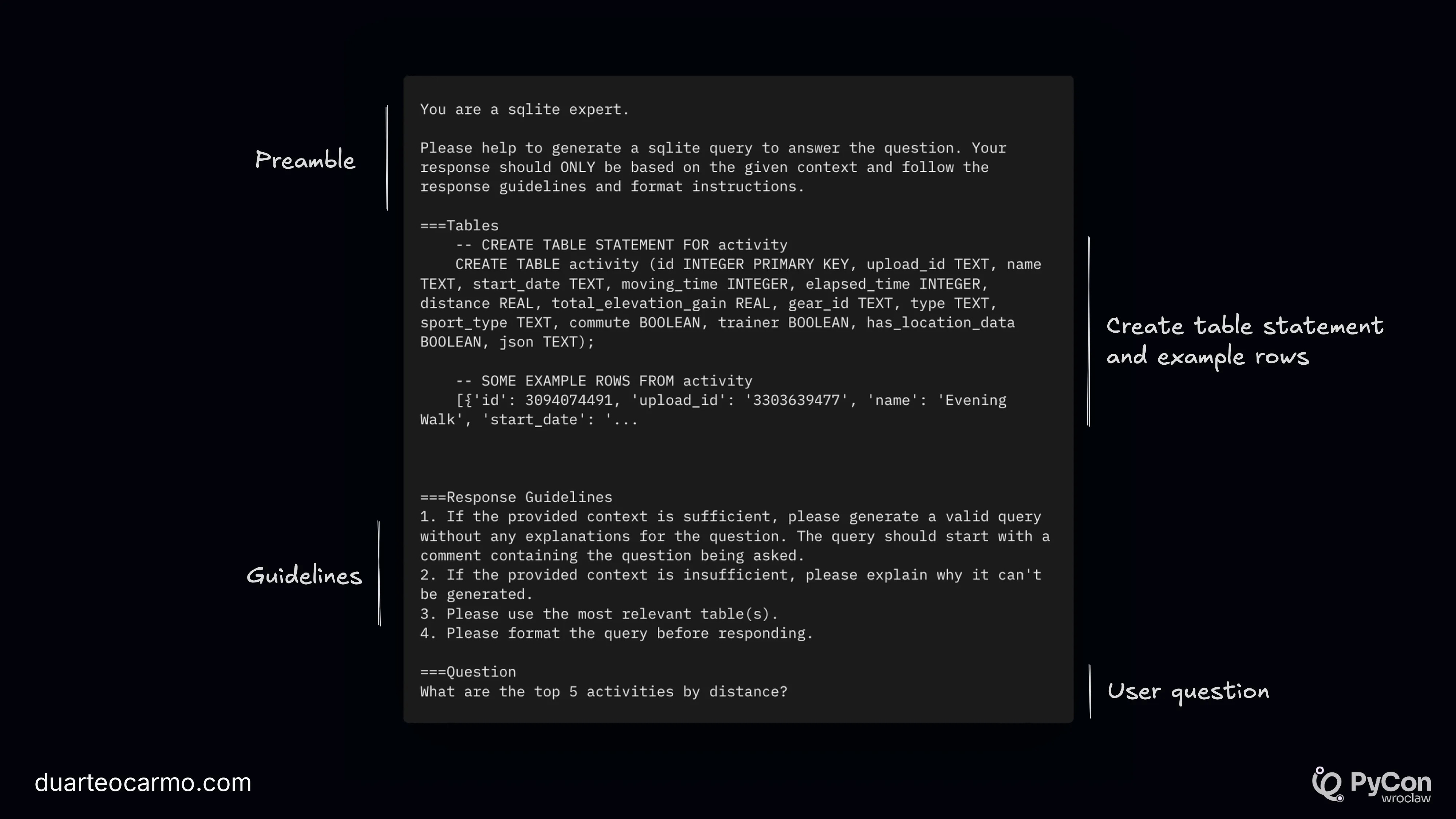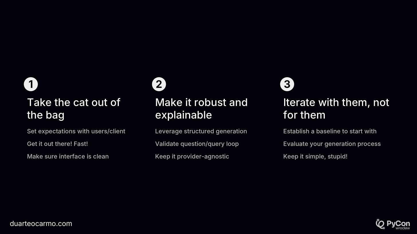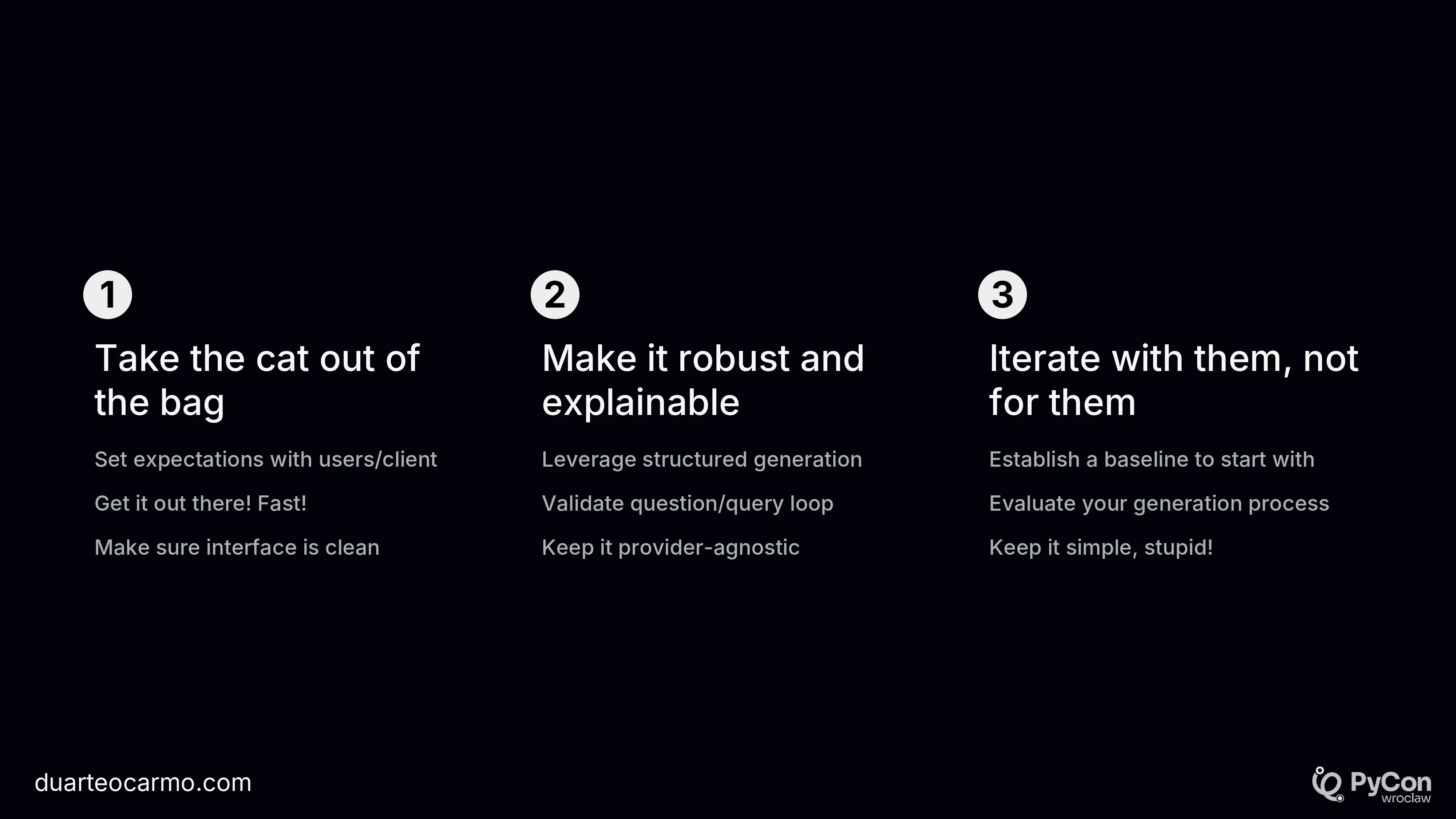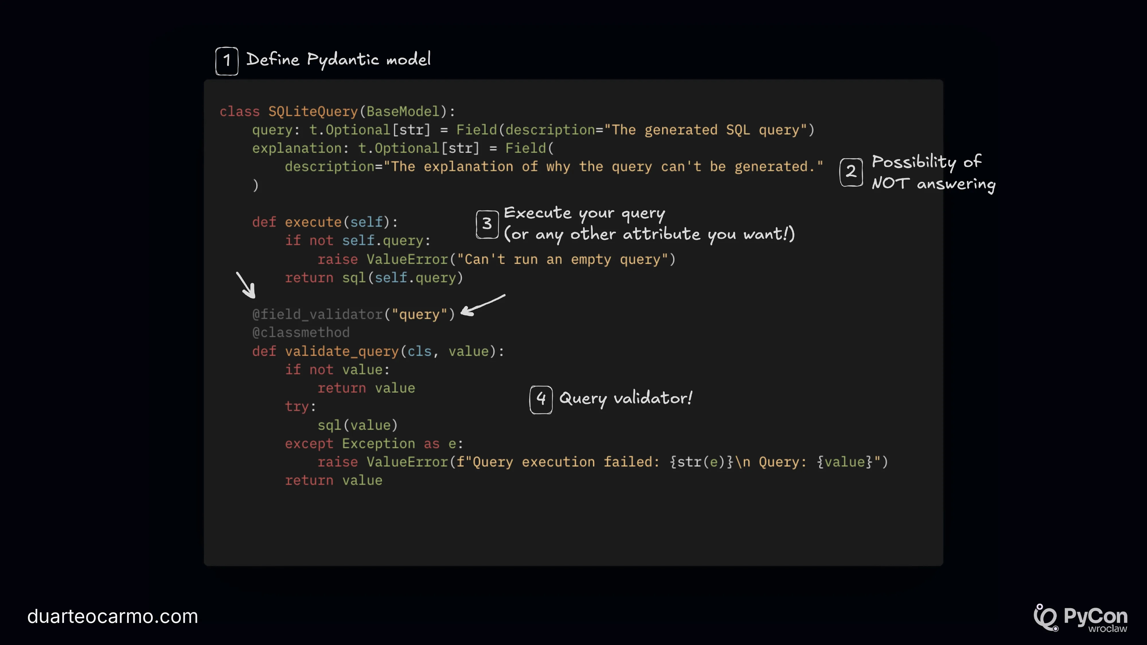 Last year I made an effort to speak less and learn more. However, I still had the opportunity to present at a couple of conferences. One of them was PyCon Wroclaw. The main goal was to talk about a couple of interesting paradigms I've come across while using LLMs to help me solve some Text-to-SQL problems.