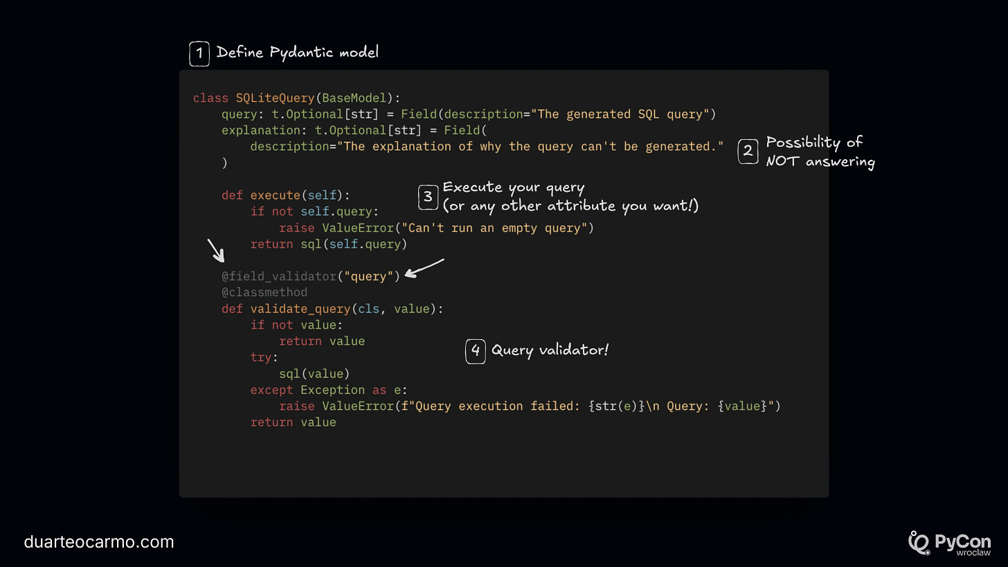 Here's a particularly nasty piece of code. I use Instructor to generate the SQL from a question, but also include a custom validator. This will ensure that whatever the LLM generates can actually be run against the database. This is of course, very dangerous. So one should not put this code in production, since you'll be opening yourself to all sorts of problems. But it's a nice way to ensure validity.