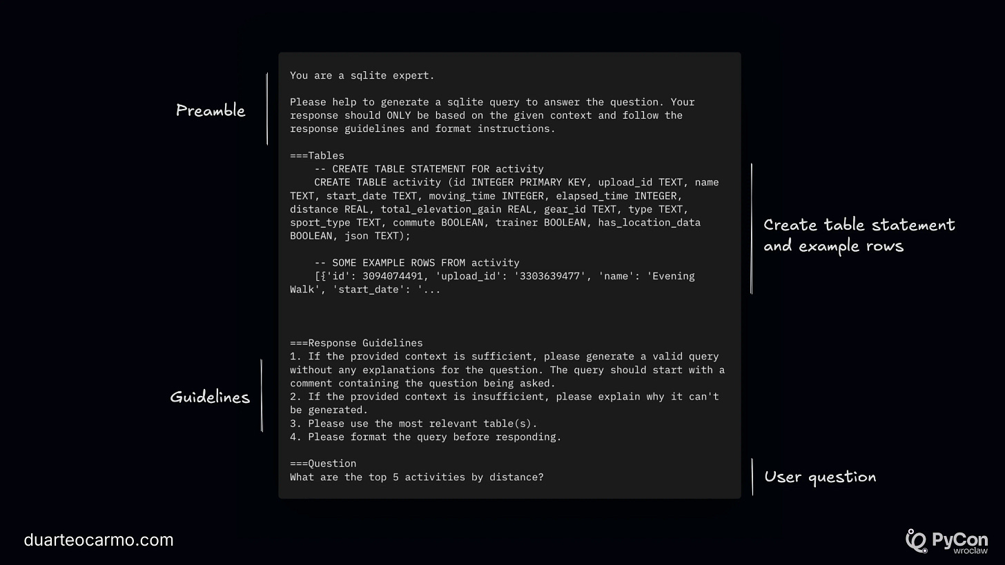My prompt structure. It includes a Preamble, the CREATE TABLE statement so that the LLM knows the structure, some response guidelines, and the user question.