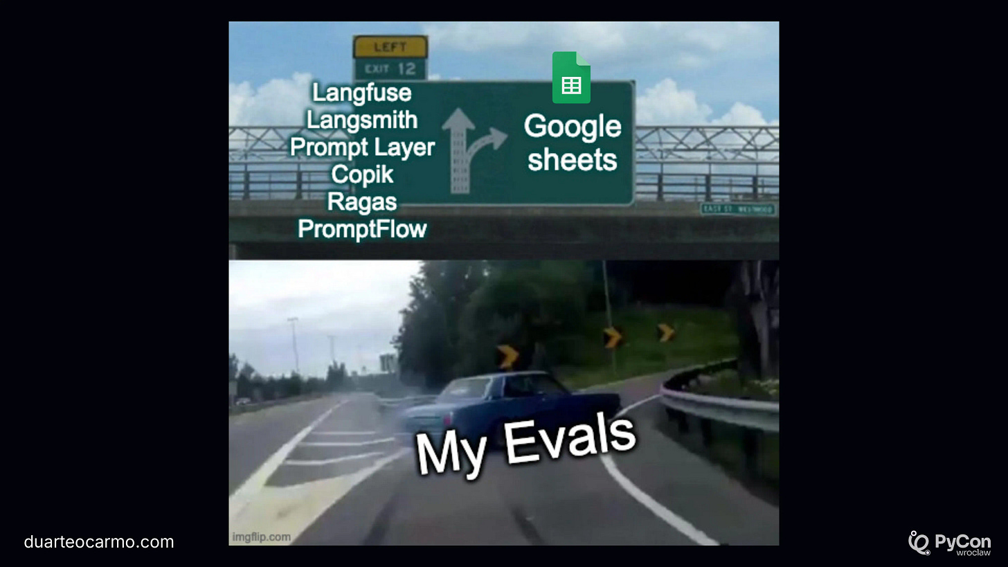 I really like looking at data, and evaluating where things go wrong. But I'm skeptical of the myriad of tools coming out to evaluate LLMs. And I'm a big fan of Google Sheets. Mainly because when I look at the data, I probably also look at it with some sort of subject matter expert. So the fewer 'things' between us and the data, the better. And Google Sheets are fine.