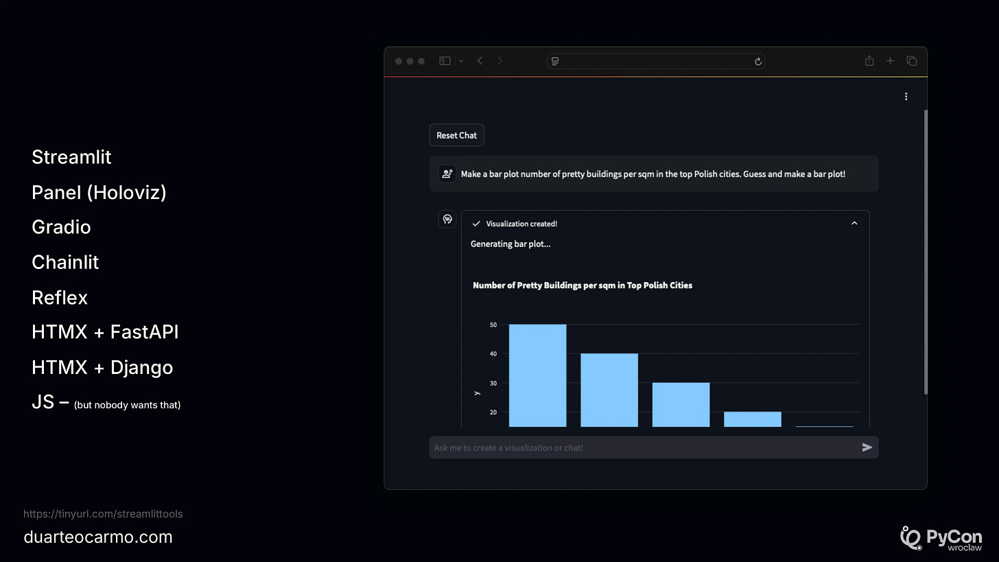 Here I mentioned some tools to get a ChatGPT interface relatively fast. So you can focus on what matters. Here's the code for a ChatGPT-like interface using Streamlit that already includes tools like plotting.