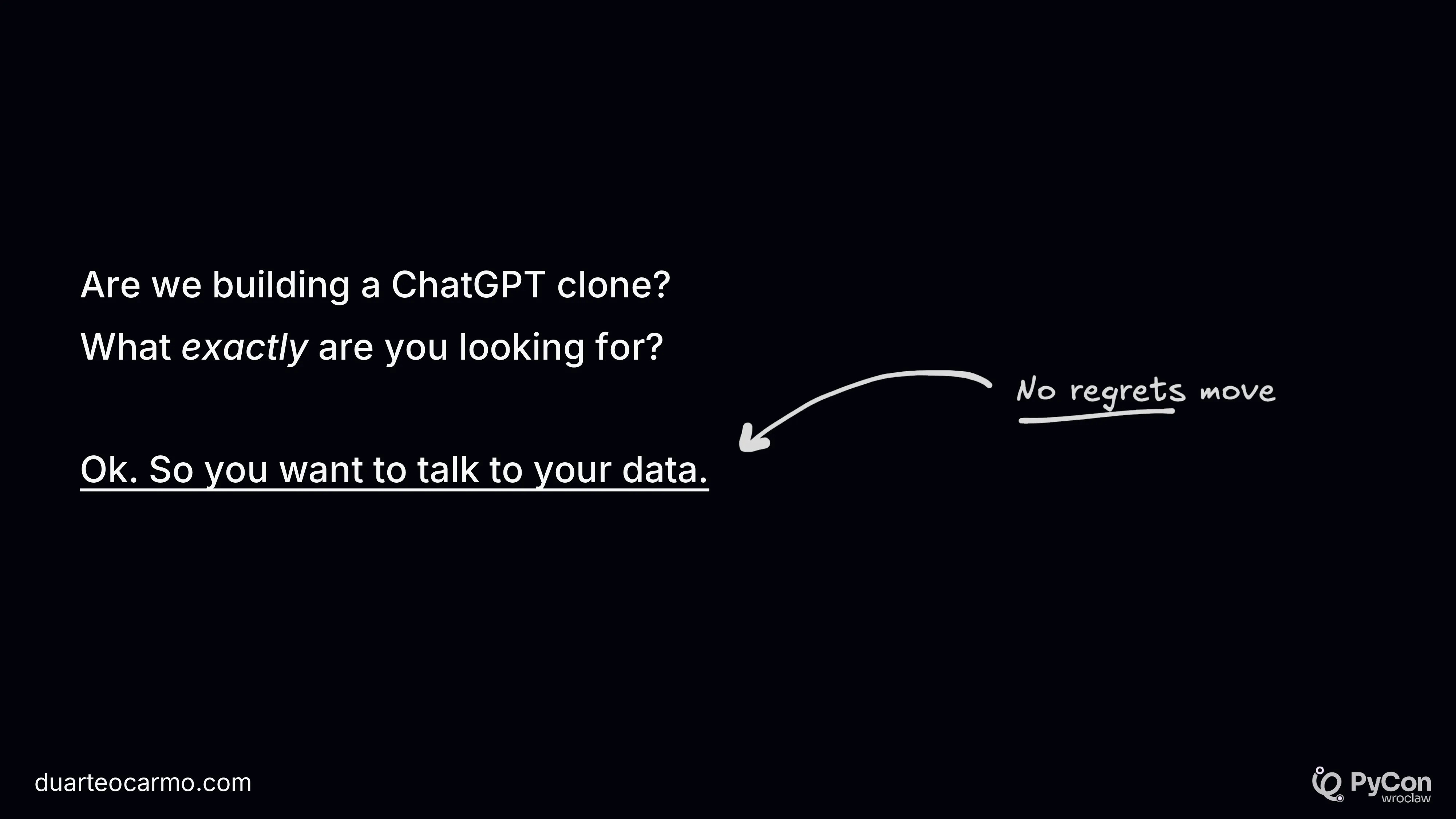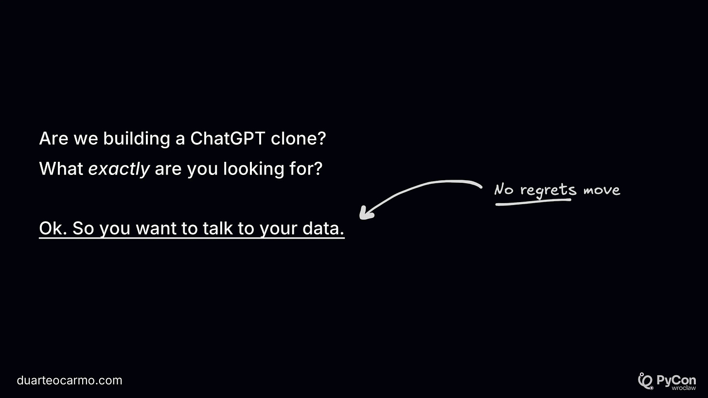 Here I introduced what I call the no regrets move. I.e., what is the minimum thing that you can solve for a certain problem that will always be valuable? In the case of text-to-sql, it's not the interface. It's just answering questions based on your data.