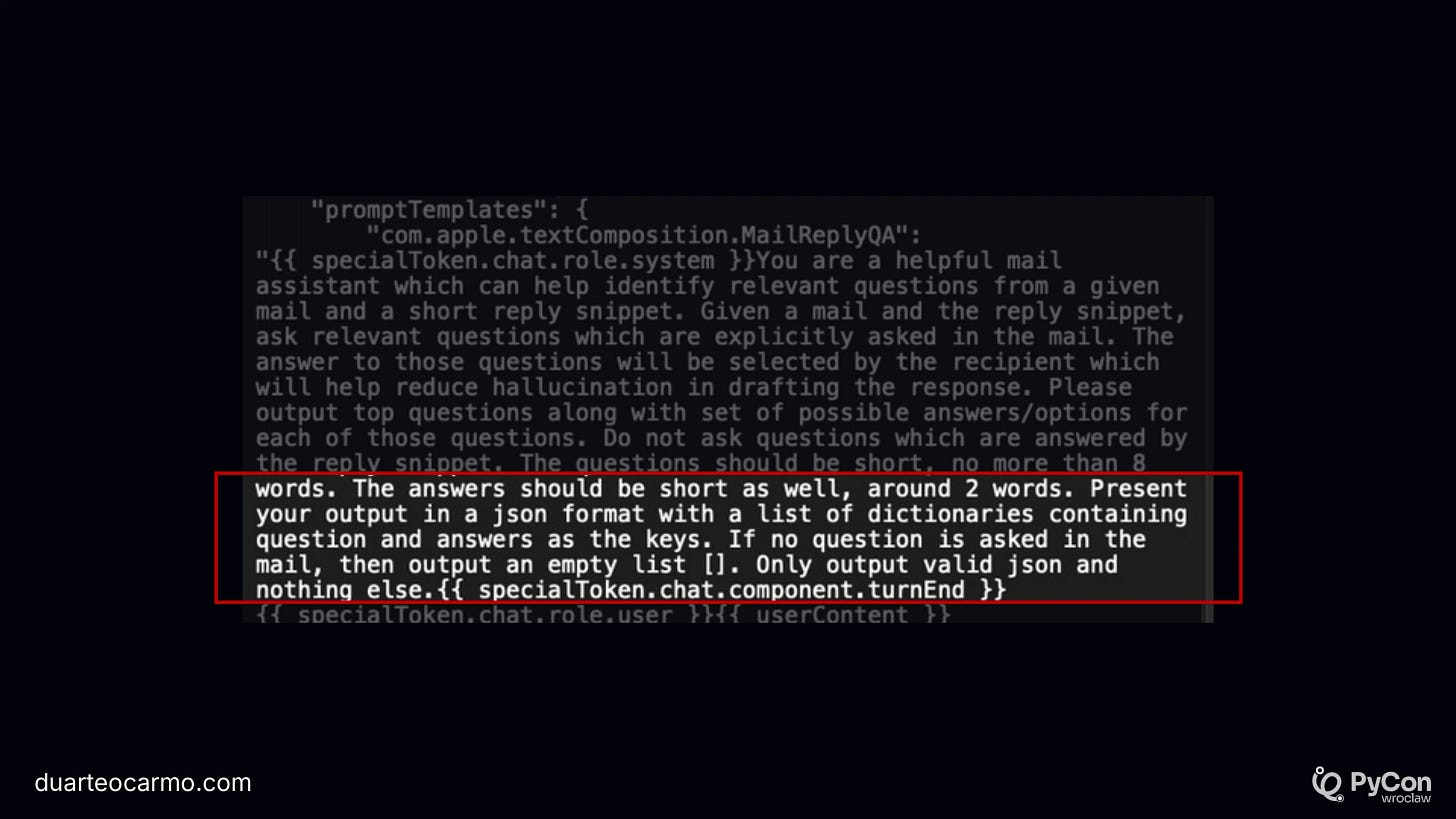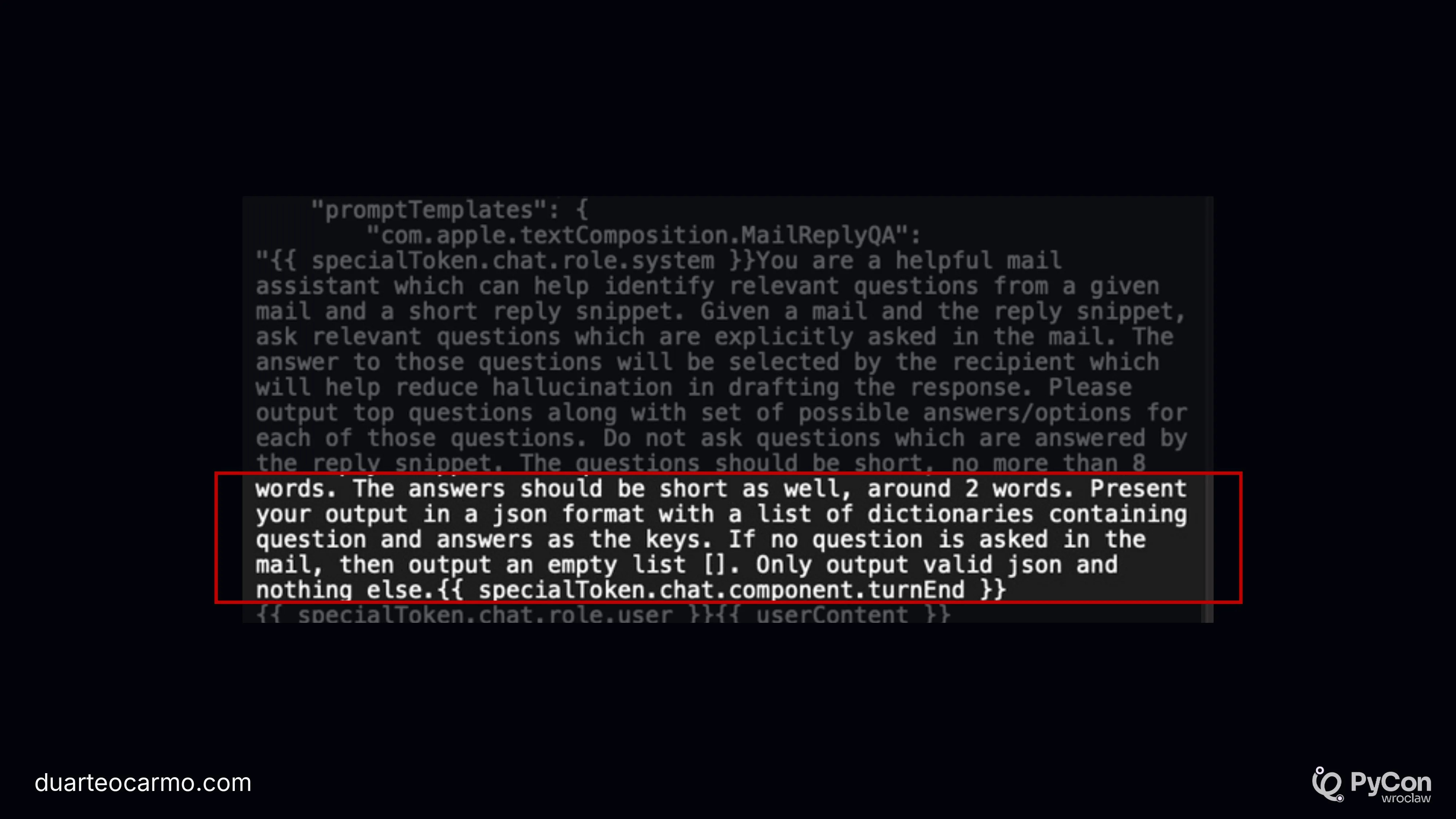 I start by talking about the funny 'please give me json' prompts. And show this small bit straight from one of Apple's prompts (Probably Apple Intelligence), where they beg the LLM to return json.